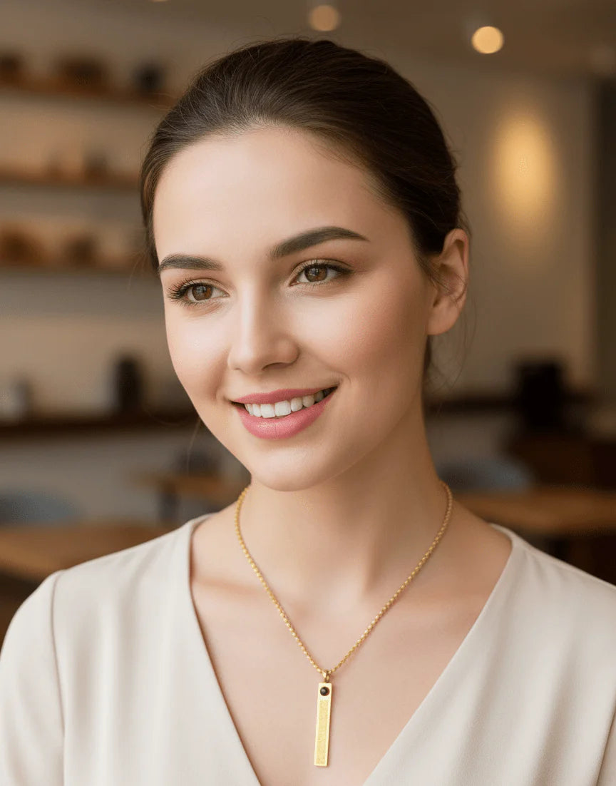 This elegant Islamic Engraved Pendant Necklace features a rectangular gold-plated bar with detailed Arabic calligraphy and a polished gemstone accent on top.